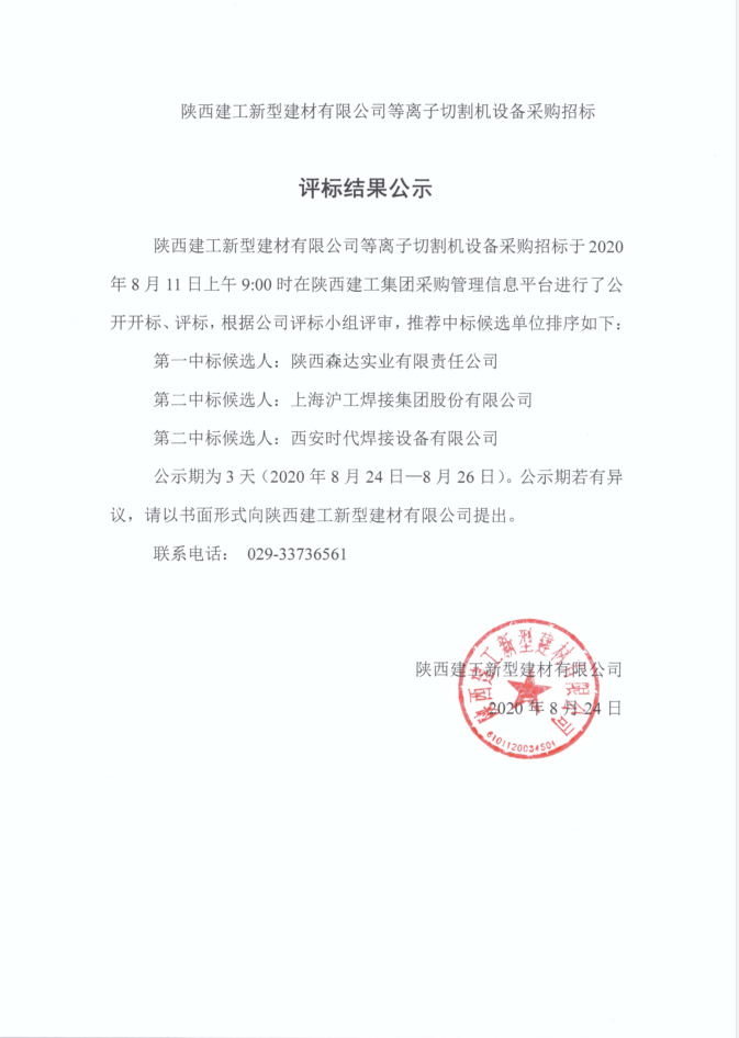 | 陜西建工新型建材有限公司等離子切割機設(shè)備采購招標 |
