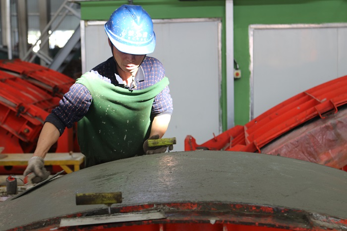 張昌杰深入市政車間,對管片生產(chǎn)流水線、養(yǎng)護(hù)系統(tǒng)等進(jìn)行了詳細(xì)了解,并從原材料、澆筑、抹面、養(yǎng)護(hù)、拆模等工藝技術(shù)專業(yè)問題與我司技術(shù)人員開展交流探討。張昌杰對我司管片產(chǎn)品質(zhì)量和生產(chǎn)能力表示了肯定,同時對目前管片制作工序提出了合理化的指導(dǎo)和建議。