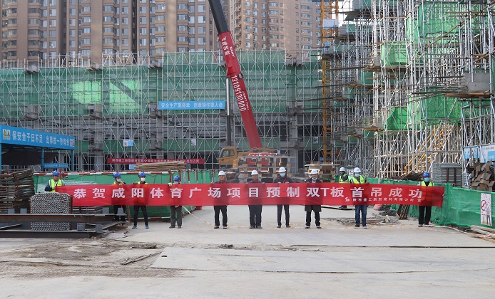 | 陜建新型建材承接的咸陽體育廣場項目預(yù)制雙T板首吊成功 |