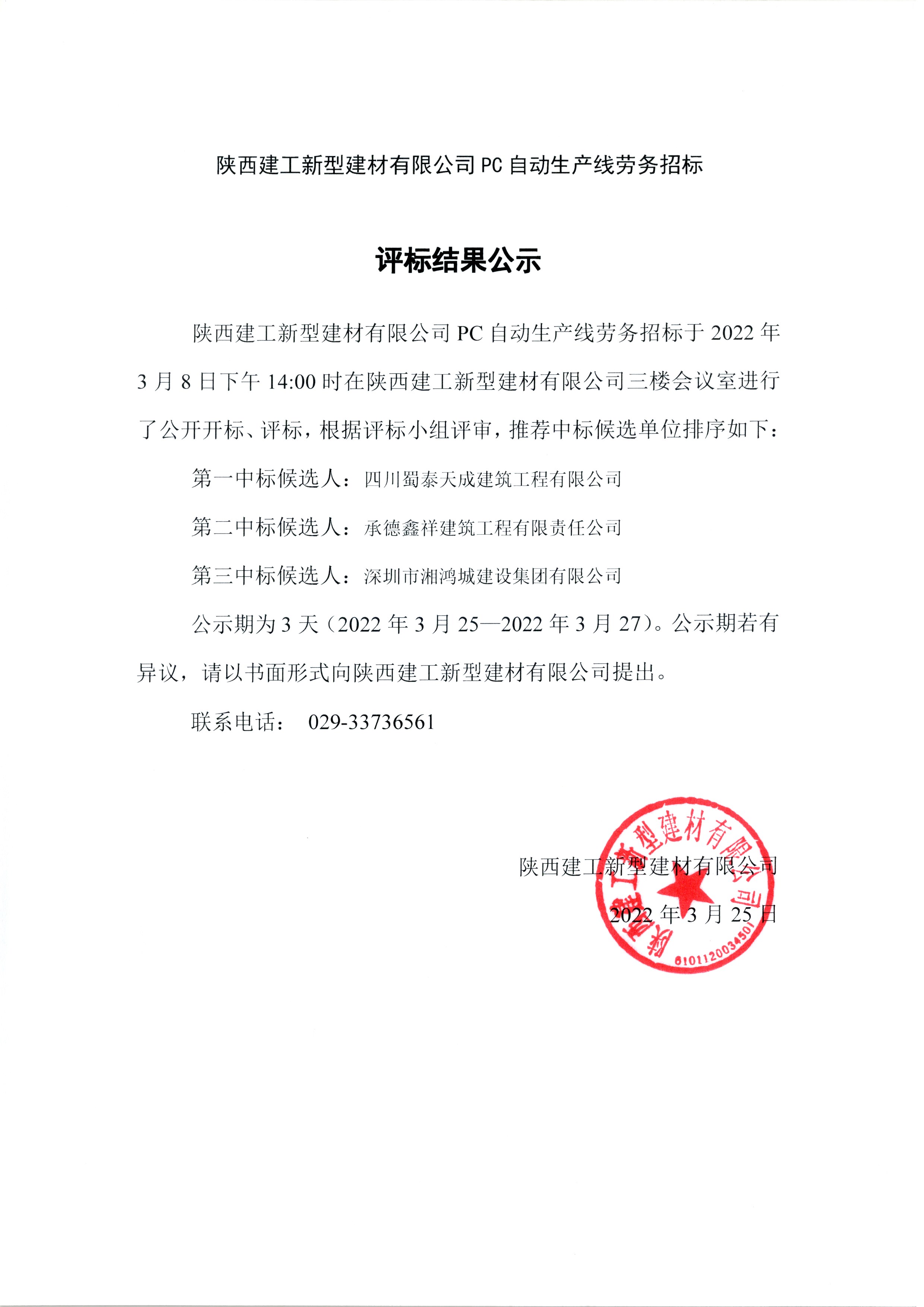 | 陜西建工新型建材有限公司PC自動生產(chǎn)線勞務招標結果公示 |