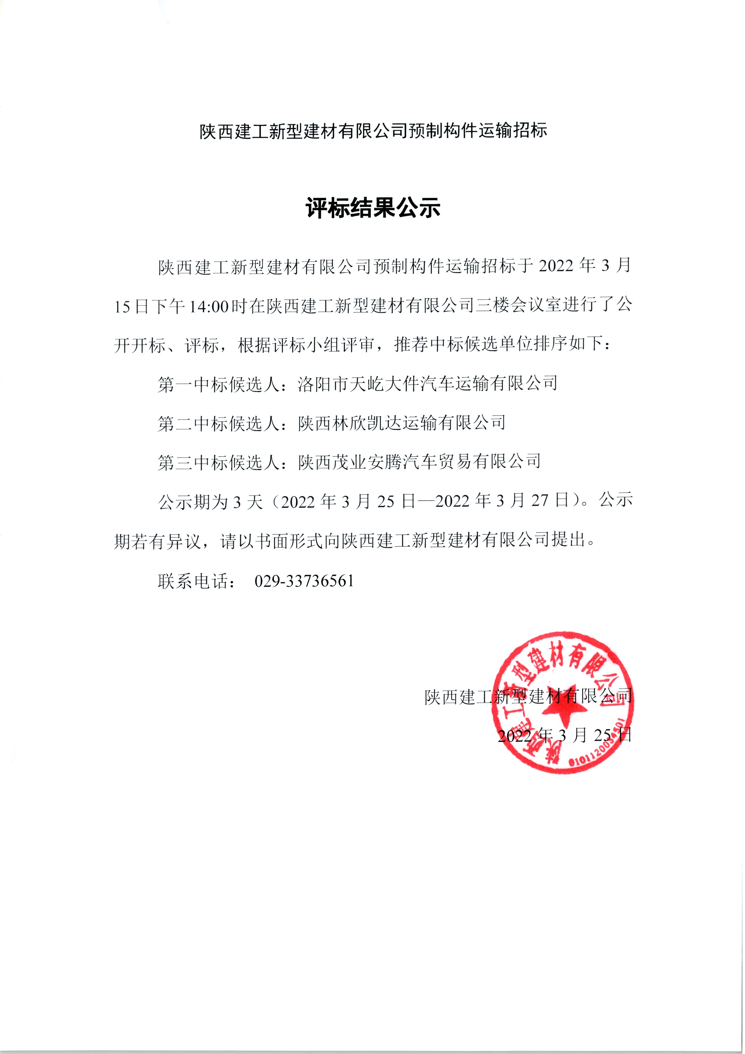 | 陜西建工新型建材有限公司預(yù)制構(gòu)件運(yùn)輸招標(biāo)結(jié)果公示 |