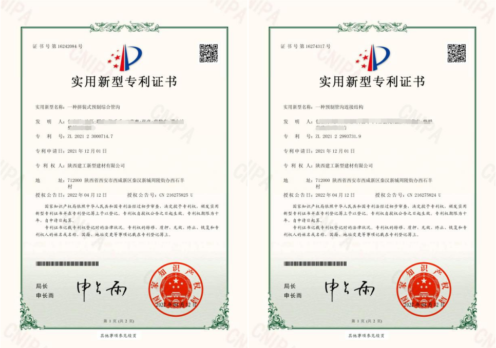 近日,經(jīng)國家知識產(chǎn)權(quán)局審批,我司研發(fā)的兩項預(yù)制管溝技術(shù)---一種拼裝式預(yù)制綜合管溝、一種預(yù)制管溝連接結(jié)構(gòu),成功通過專利授權(quán)。